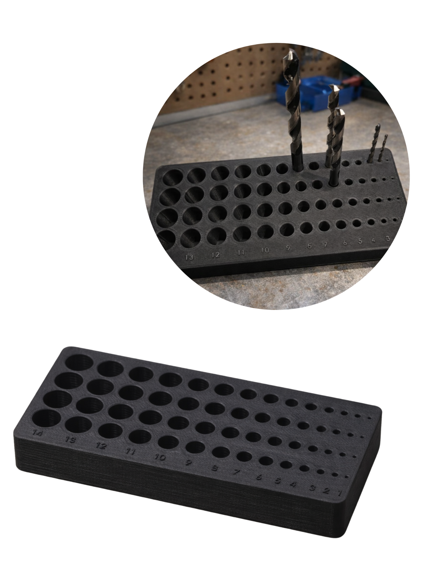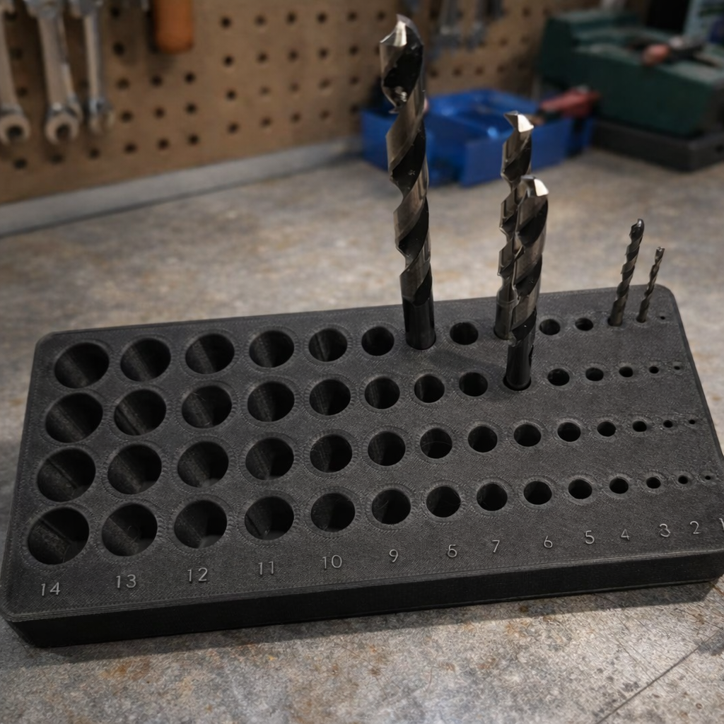 Praktyczny organizer na wiertła, który mieści 4 komplety wierteł od 1 do 14 mm. Idealny do warsztatu, garażu, busa serwisowego i domowego kącika majsterkowicza. Wszystkie średnice są wyraźnie opisane, dzięki czemu od razu widzisz, czego brakuje i gdzie odłożyć konkretne wiertło.