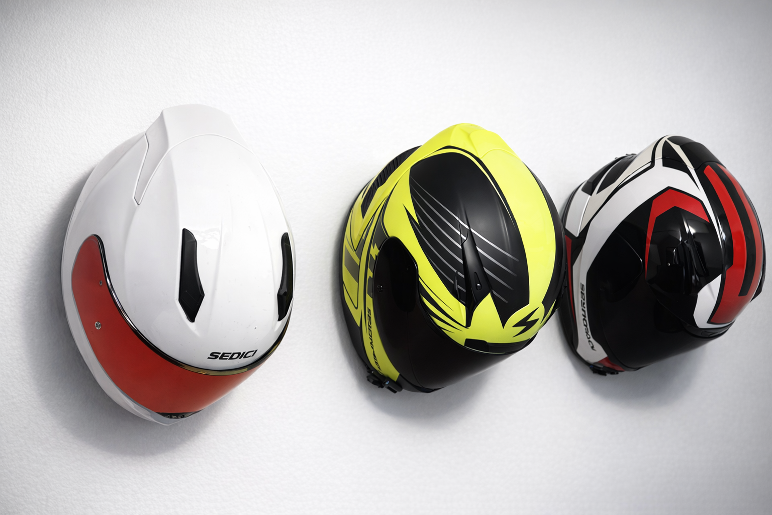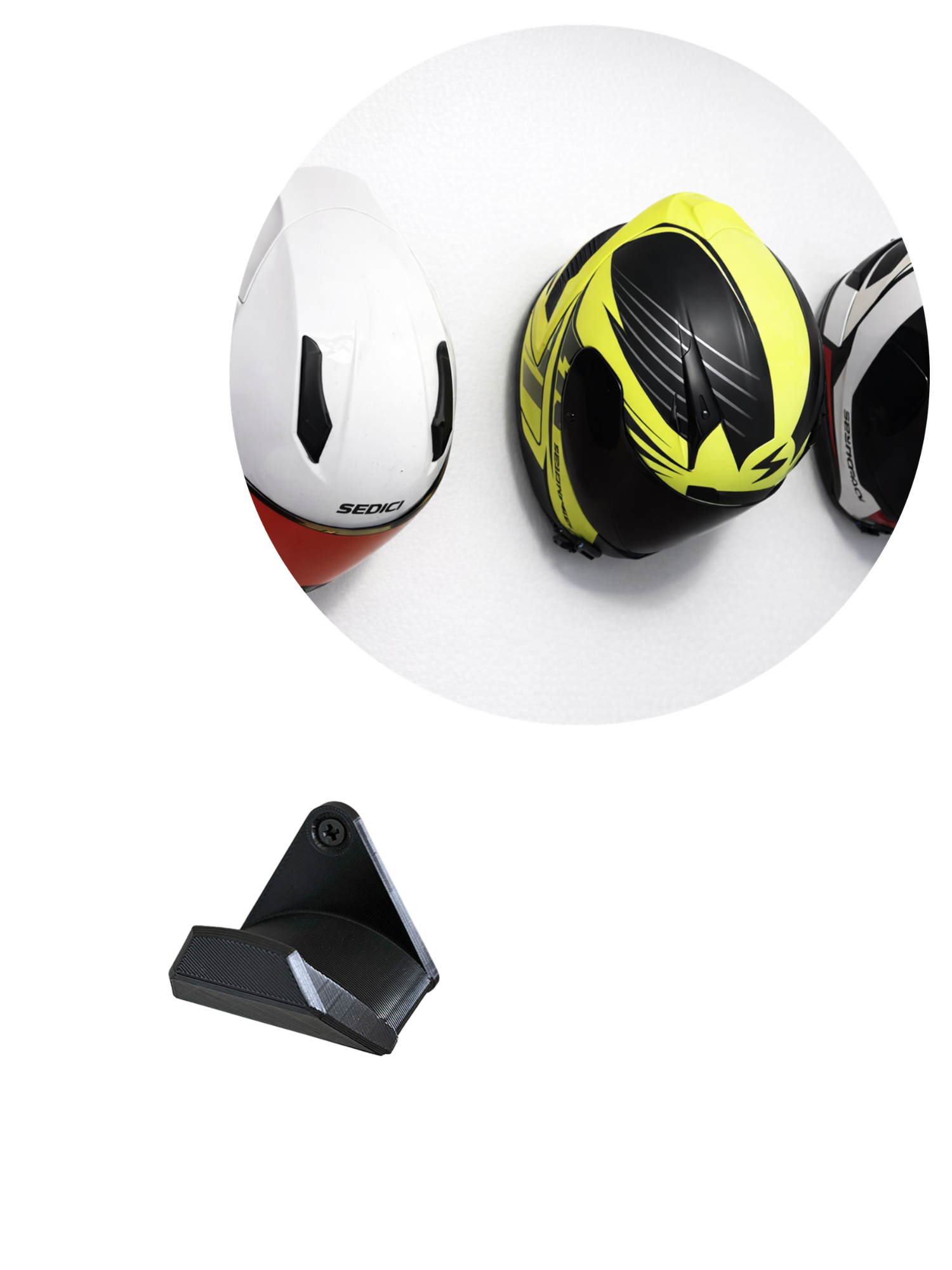 Prosty, kompaktowy uchwyt ścienny do przechowywania kasku motocyklowego. Został zaprojektowany tak, aby kask wisiał „od tyłu” – otworem do ściany. Dzięki temu do wnętrza nie wpada kurz, a wyściółka i szybka są lepiej chronione przed zabrudzeniem.
