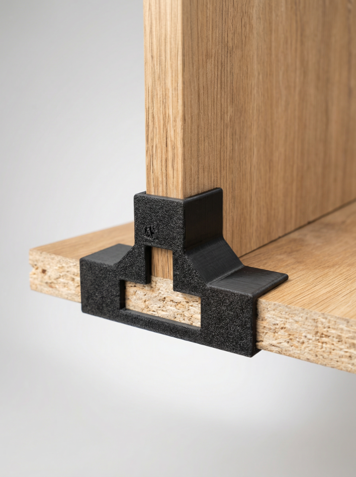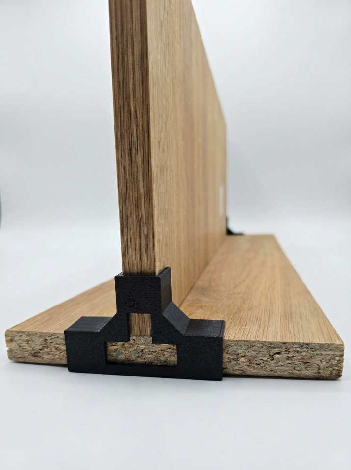Uchwyt w kształcie T ułatwia ustawienie elementu wewnętrznego (np. przegrody lub półki) względem boku korpusu pod kątem 90°. To szczególnie przydatne, gdy musisz jednocześnie trzymać elementy, mierzyć, nawiercać i skręcać – uchwyt przejmuje rolę „trzeciej ręki”.