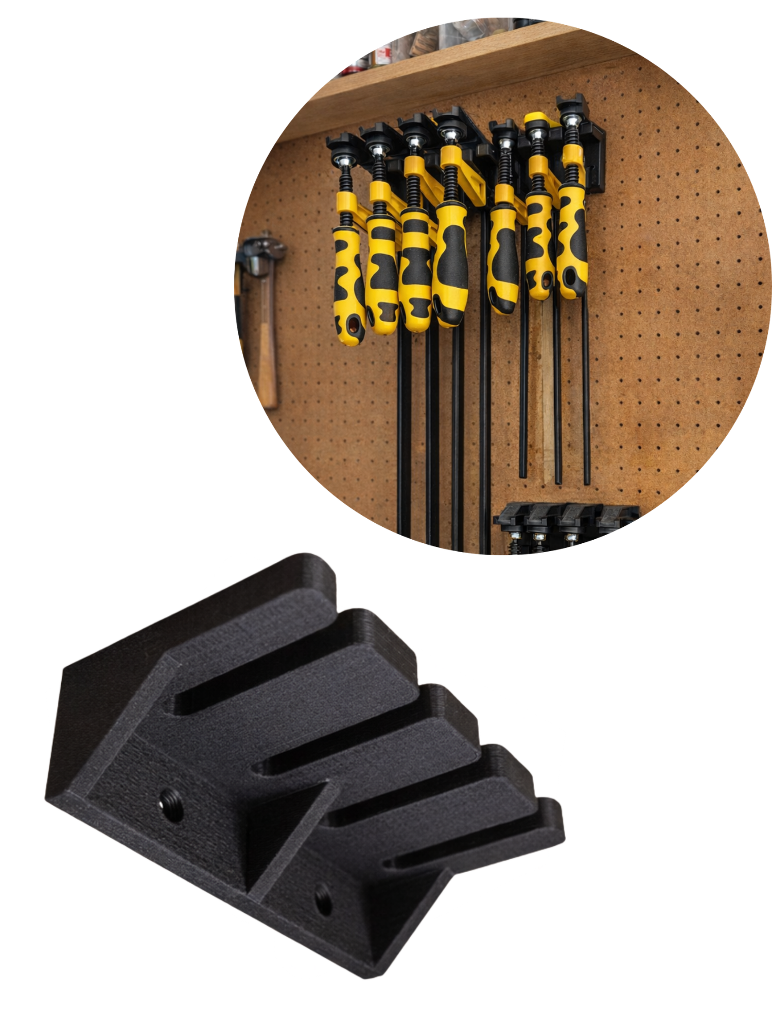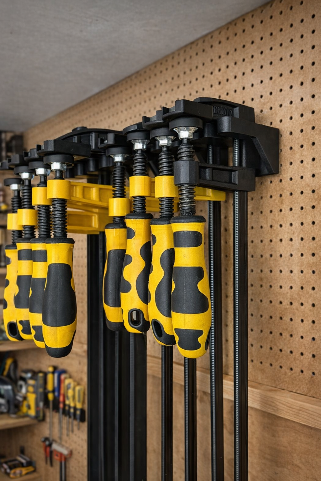 Kompaktowy uchwyt ścienny na 4 ściski typu F. Idealny do małych warsztatów, gdzie liczy się porządek i szybki dostęp do narzędzi.