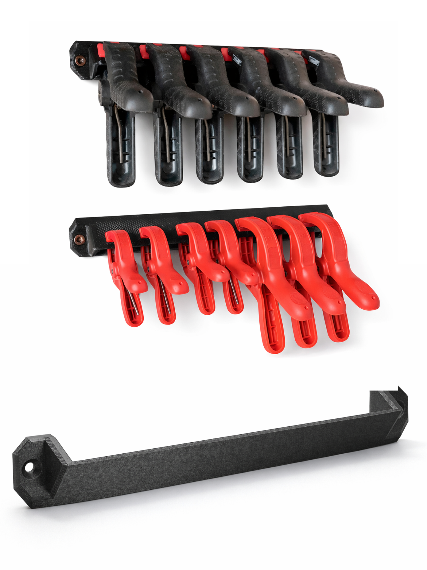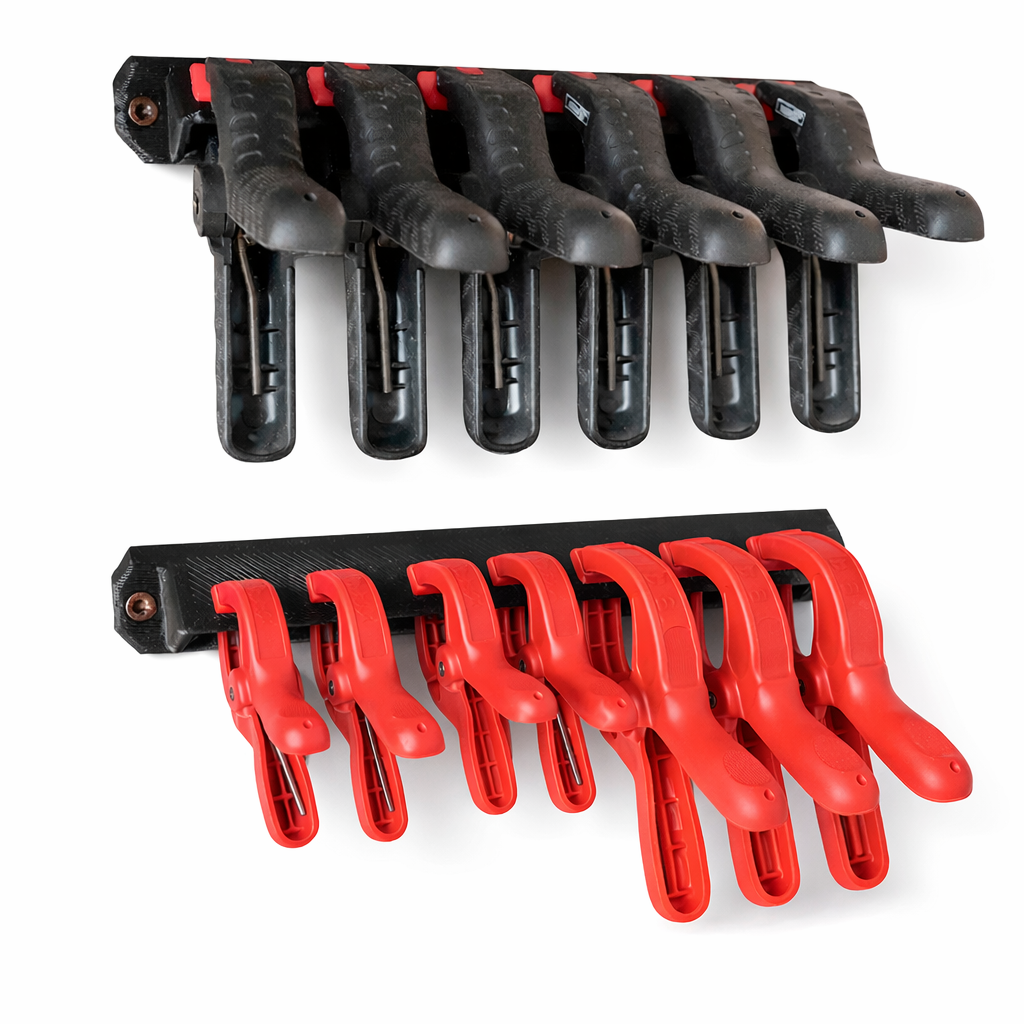Praktyczny uchwyt ścienny do przechowywania ścisków sprężynowych (potocznie: „klamerki”, „żabki”). Pozwala uporządkować mini ściski w warsztacie i mieć je zawsze pod ręką podczas klejenia i montażu – bez walania się po blacie.