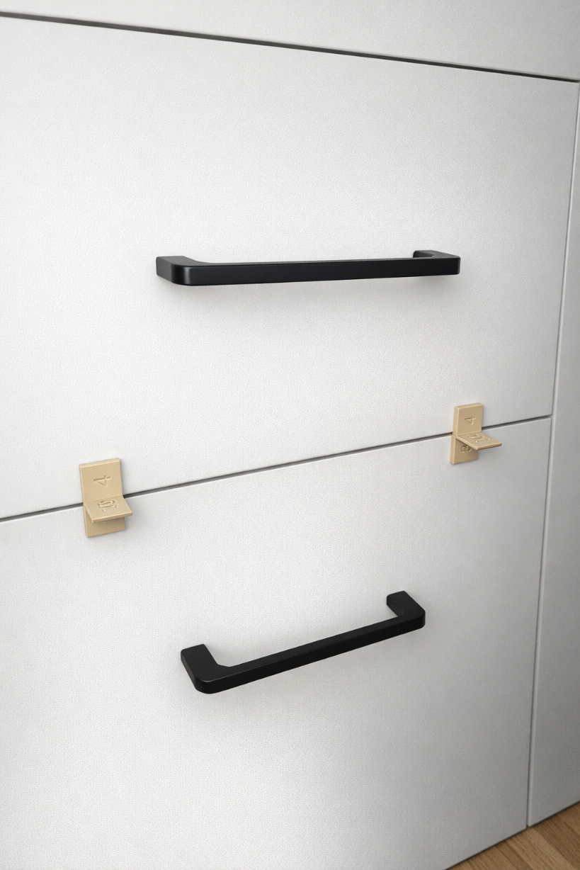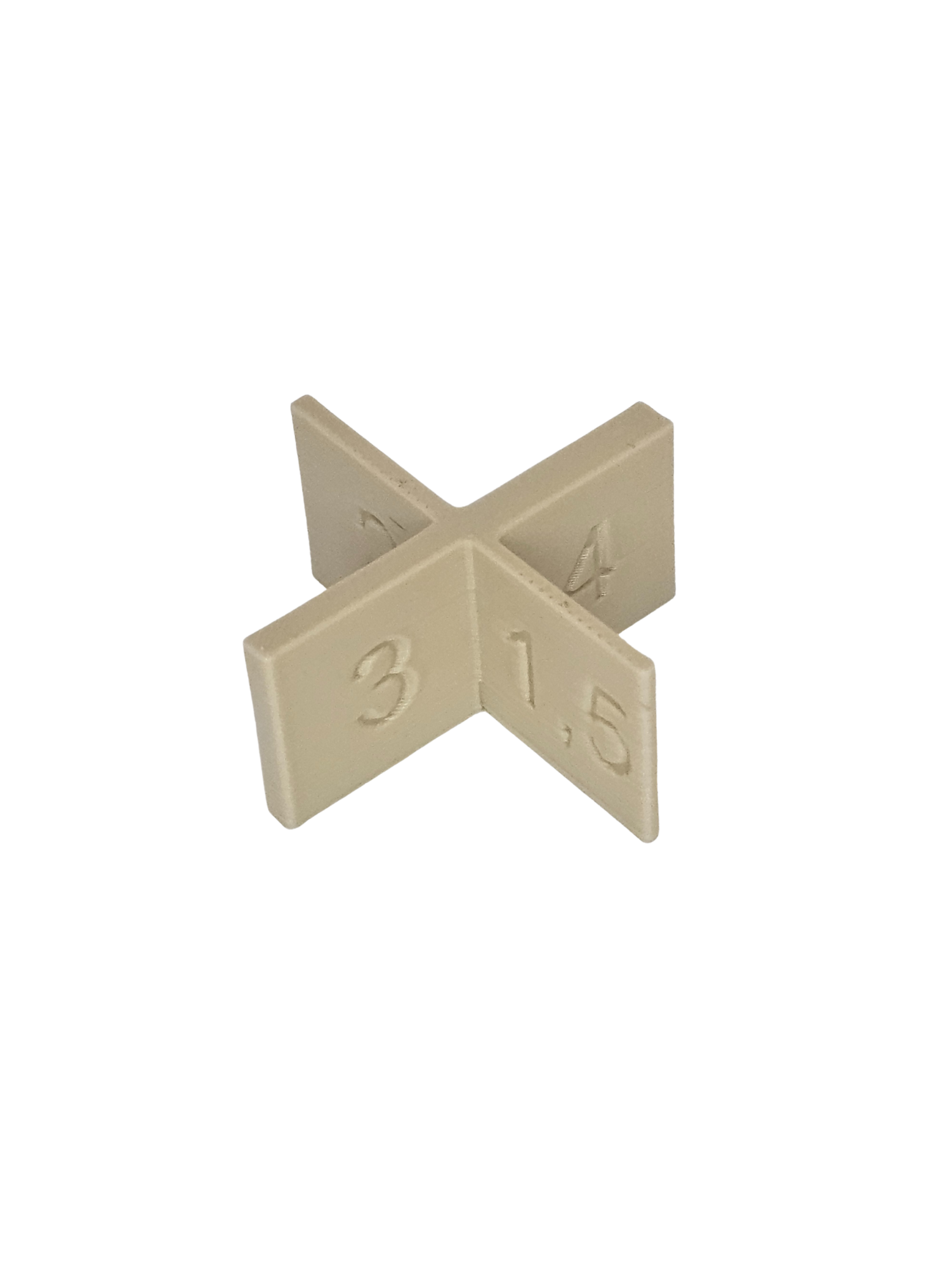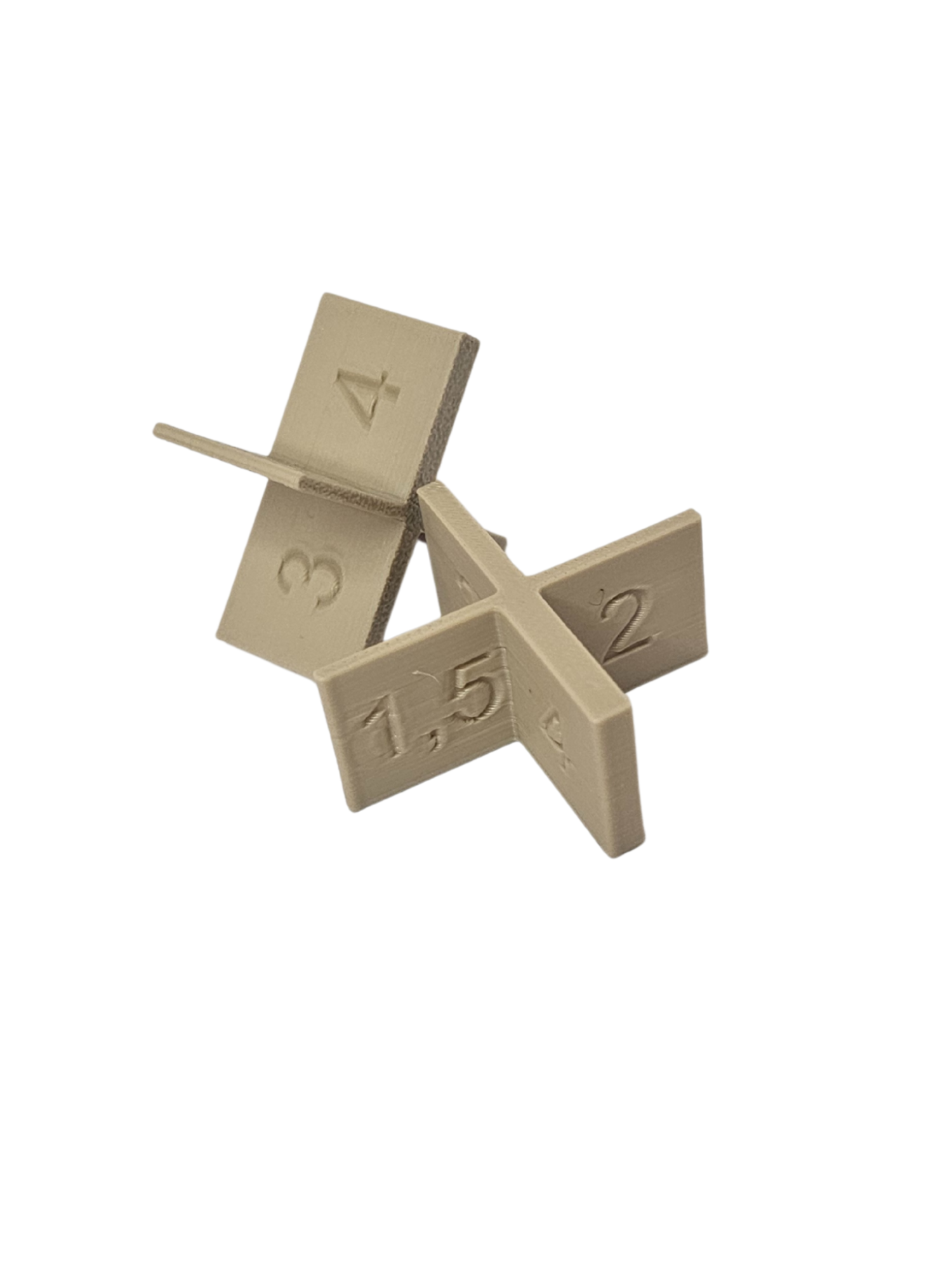 Zestaw praktycznych dystansów do precyzyjnej regulacji szczelin między frontami meblowymi. Każdy element ma kształt krzyżyka, a każde ramię inną grubość: 1,5 mm, 2 mm, 3 mm oraz 4 mm. Dzięki temu jednym dystansem szybko dobierzesz właściwy luz między frontami szafek, szuflad czy drzwi zabudowy kuchennej i powtórzysz go na całej instalacji.
